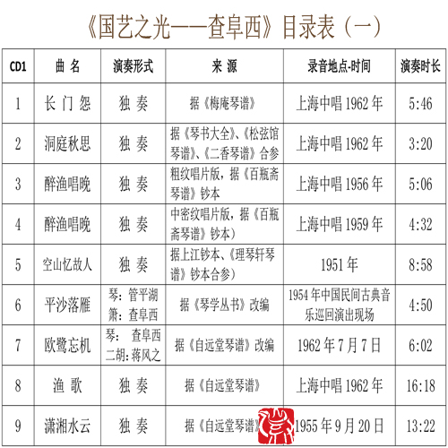 查先生在一九三零年代就享有“查潇湘”的盛名。他在广采博收的基础上,形成古朴儒雅、温润醇厚、疏朗恬淡的查氏琴风,拥有《潇湘水云》、《洞庭秋思》、《渔歌》、《醉渔唱晚》、《古怨》、《苏武思君》等广有影响的代表曲目。