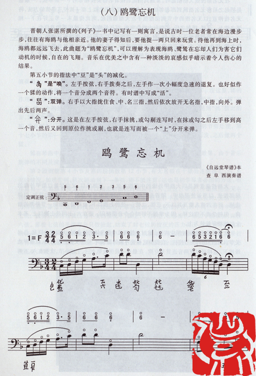 本教程以第星期上一次课,每天练习一小时的进度,经过半年,中等爱好程度、中等接受能力的人,可以学会《秋风词》、《阳关三叠》、《酒狂》、《平沙落雁》四曲。此次教程的出版,比原有的教材稿增加了《鸥鹭忘机》、《普庵咒》、《关山月》、《长门怨》四曲,可以帮助学琴者巩固已经取得的演奏基础。”