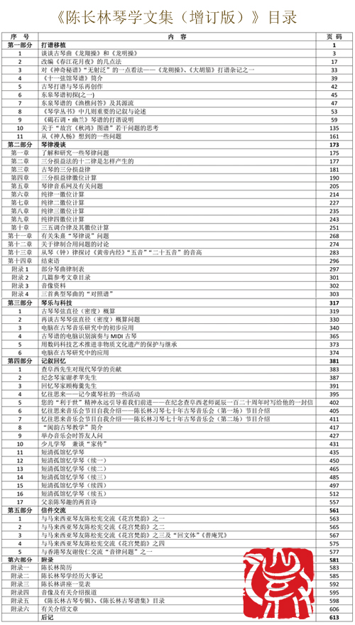 2017年夏,《陈长林琴学文集(增订版)》由文艺出版社出版。 内容较初版增加篇幅很大。《陈长林琴学文集》2012年初版,共392页。本次增订再版,增添了大量内容,篇幅增至615页。