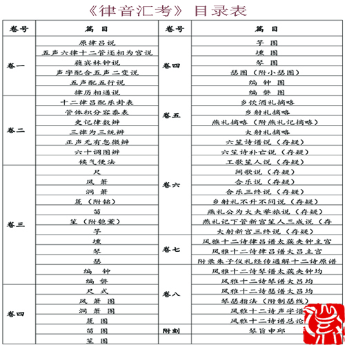 《重刻律音汇考》为《律音汇考》之重刻本,以重振文庙祭祀礼乐为旨归,按“律吕溯源”“乐器审音”“仪礼尊经”“诗乐存古”的思路,将礼、乐熔于一炉。清邱之稑撰,汪树堂重刻。