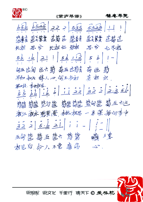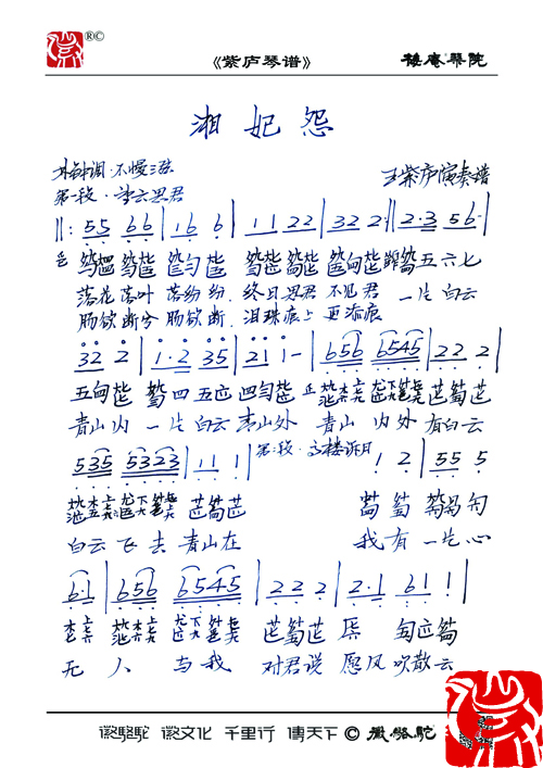 《湘妃怨》被称为《秋风词》的姊妹篇,均系梅庵琴歌。梅庵琴人吴宗汉传谱,海内外广为传播,旋律优美,耳熟能详。在流传过程中,大家更喜欢称之为《湘江怨》,本名《湘妃怨》反倒提得少了。吴宗汉(1904-1991),著名琴家,师从梅庵徐立孙。所传歌词与《湘妃怨》古谱基本相同,少数语句略有改动,比如“肠断断肠肠欲断”改成“肠欲断兮肠欲断”,另外个别之处加了衬词,以方便演唱。