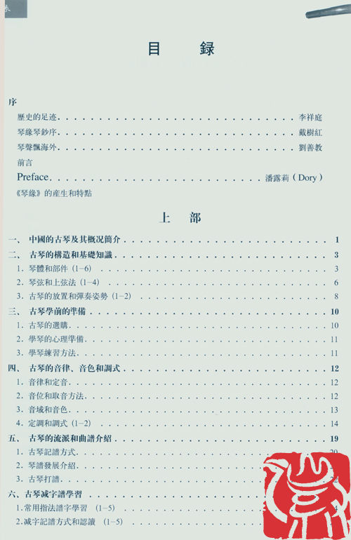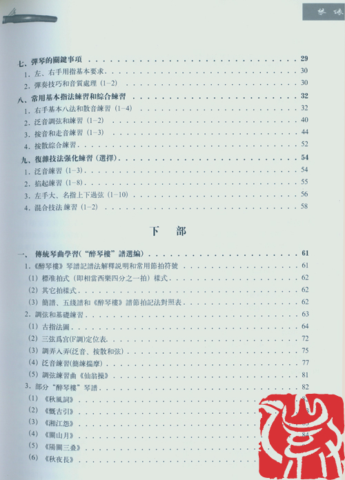 上部是介绍中国的古琴和它悠久深远的历史,以及学习古琴的路径。通过基本指法的介绍和自编乐句实例的学习,由浅入深、循序渐进的掌握古琴复杂多变的指法。并增加一些选择学习内容,有难度较高的、较复杂的技法和上下过弦连贯弹奏的乐句实例,作为强化练习,为提高学生运指技巧和顺利进入传统琴曲的学习打好基础。