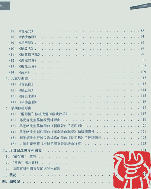 《醉琴楼》琴谱的特点是:在竖版古琴指法谱,对应加上西乐简谱借鉴而来的数字和节拍符号的综合谱式,见谱即能视唱。这种记谱形式是介于工尺点拍和古琴简谱之间,起承上启下作用。