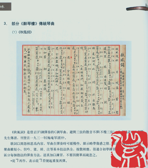下部传统曲目学习部分,是以《醉琴楼》琴谱的手抄本原样影印件的学习为基础,琴生们可学习和接触到,既能保持古琴传统古谱原来的形式,又可同时掌握琴曲节奏、节拍,如同古琴简谱一样方便,则直接见谱视唱和弹奏练习。