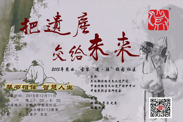 本活动为文化部非物质文化遗产司、中国非物质文化遗产保护中心、中国昆剧古琴研究会“把遗产交给未来”系列活动之一。本周五晚,王紫庐先生将应邀在安徽大学举办专题讲座,以其独特视角畅谈古琴艺术,分享习琴感悟。