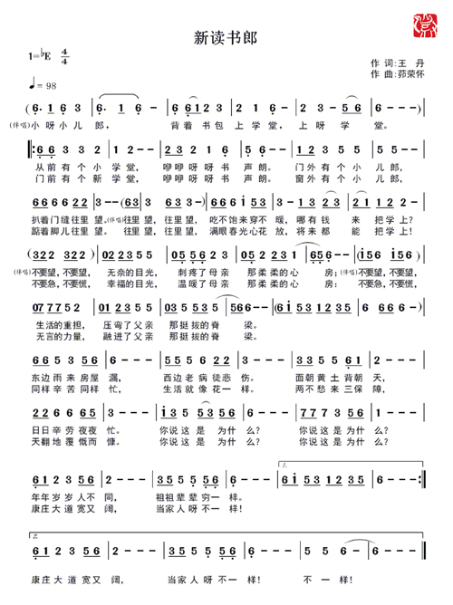 【编者按】本歌为2021年建党100周年而作,通过读书郎这个小视角,反映新旧时代天翻地覆的变化,歌唱新时代、新生活,歌颂脱贫攻坚历史性伟大成就,歌唱党、歌唱社会主义道路。这首作品可用于演唱、诗朗诵、舞台剧等。 茆荣怀先生谱曲。