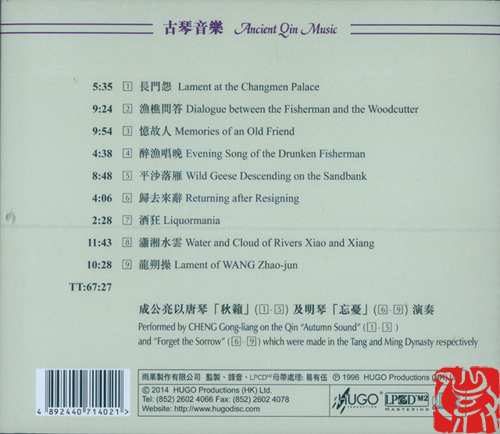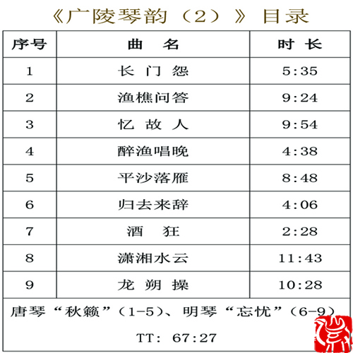 唐琴“秋籁”——仲尼式,冰裂断纹,深褐漆色,琴体圆浑。音色古雅细腻、圆润,余韵绵长,音量弱小。琴底刻有“秋籁”及印章“德斋珍藏”,腹内藏朱毫楷书“大唐开元三年李晋制”诸字。是否为唐代遗物,琴界看法尚不一致。此琴曾由清末民初名琴家叶诗琴收藏,1985年成公亮在山东济南得此琴时已残破不堪,同年伏天修复于济南。