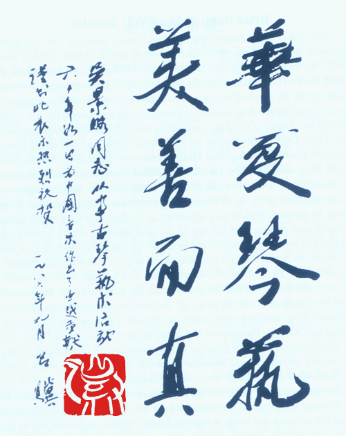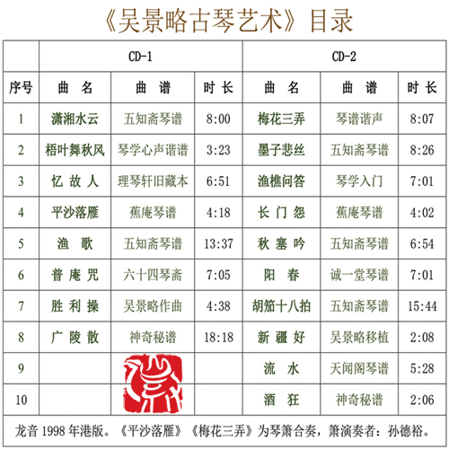 此专辑收录了吴氏的18首精选录音,部份是永不复得而至为珍贵的实况演奏,并随图文集附录了吴氏至为重要的著作《学琴常识》和指法示范围照数十帧,以便古琴爱好者能详加欣赏、学习及研究。