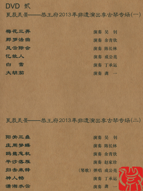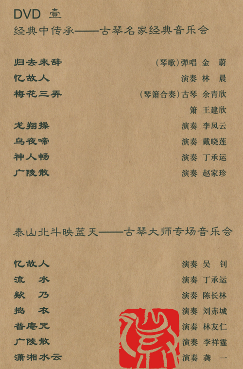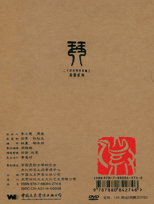 《把遗产交给未来——古琴名家名曲集粹》DVD将由中国文采声像出版公司出版发行。本专辑包含2张DVD